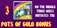 The famous Pots are the most sought after win on all versions of Rainbow Riches, they only appear on the middle 3 wheels and can award very big wins, on the original Rainbow Riches bronze pot would be anything from £50-£100, silver pot can award £150-250 and the gold pots are £400 & £500, the recently popular 'pots of gold' awards progressive pots, starting at £50, £150 & £250 which increase with every game played. |